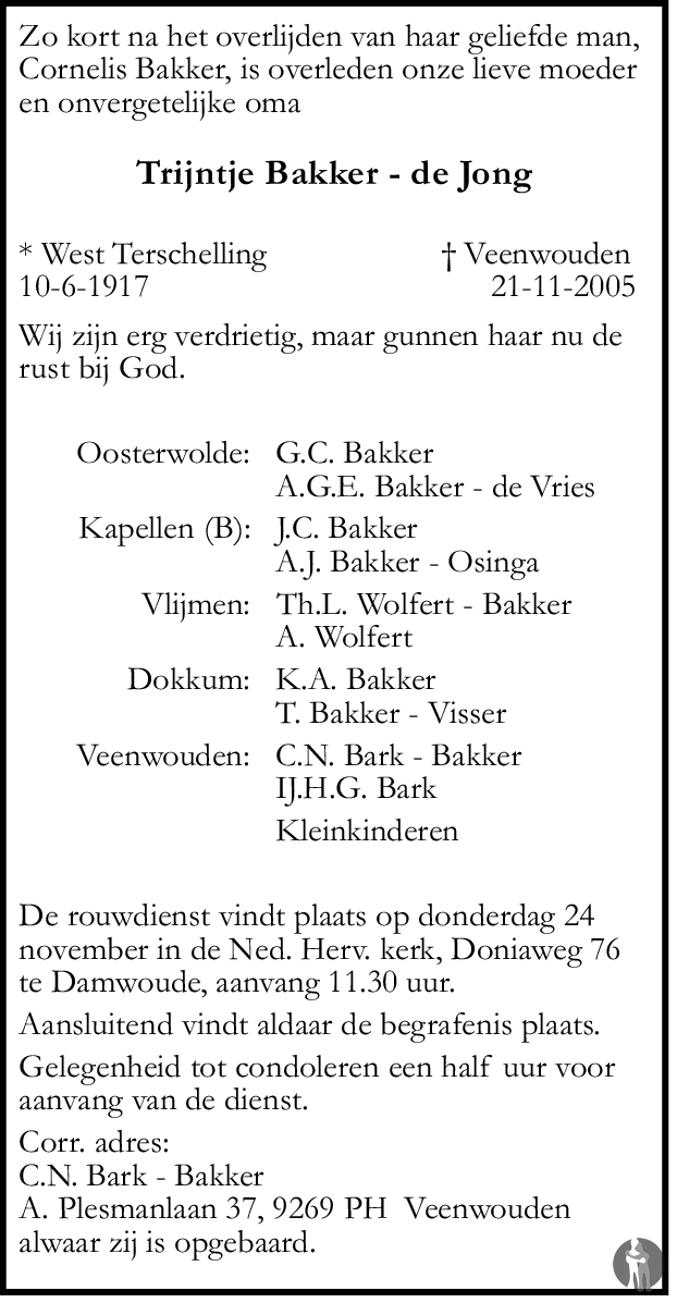 Trijntje Bakker de Jong 21112005 overlijdensbericht en condoleances Mensenlinq.nl