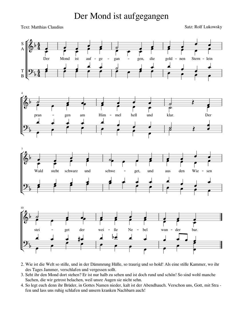 1) Der Mond ist aufgegangen, die goldnen Sternlein prangen am Himmel hell und klar. Der Wald steht schwarz und schweiget, und aus den Wiesen steiget der weiße Nebel wunderbar. 2) Wie ist die Welt so stille und in der Dämmrung Hülle so traulich und so hold als eine stille Kammer, wo ihr des Tages Jammer verschlafen und vergessen sollt.