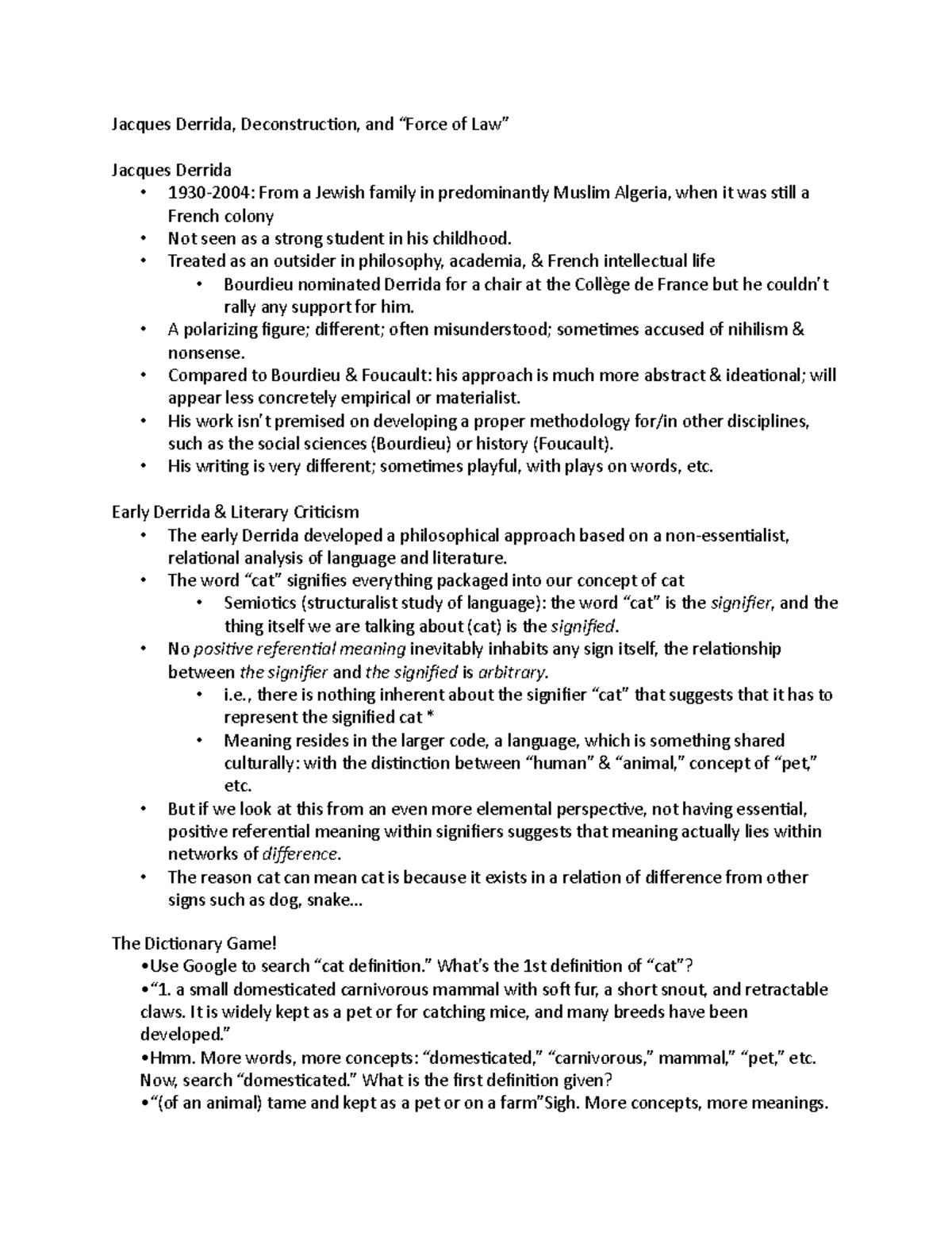 Soc3310 test 2 lecture and power point notes Jacques Derrida, Deconstruction, and “Force of