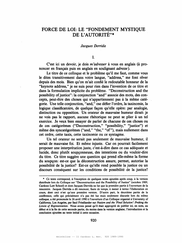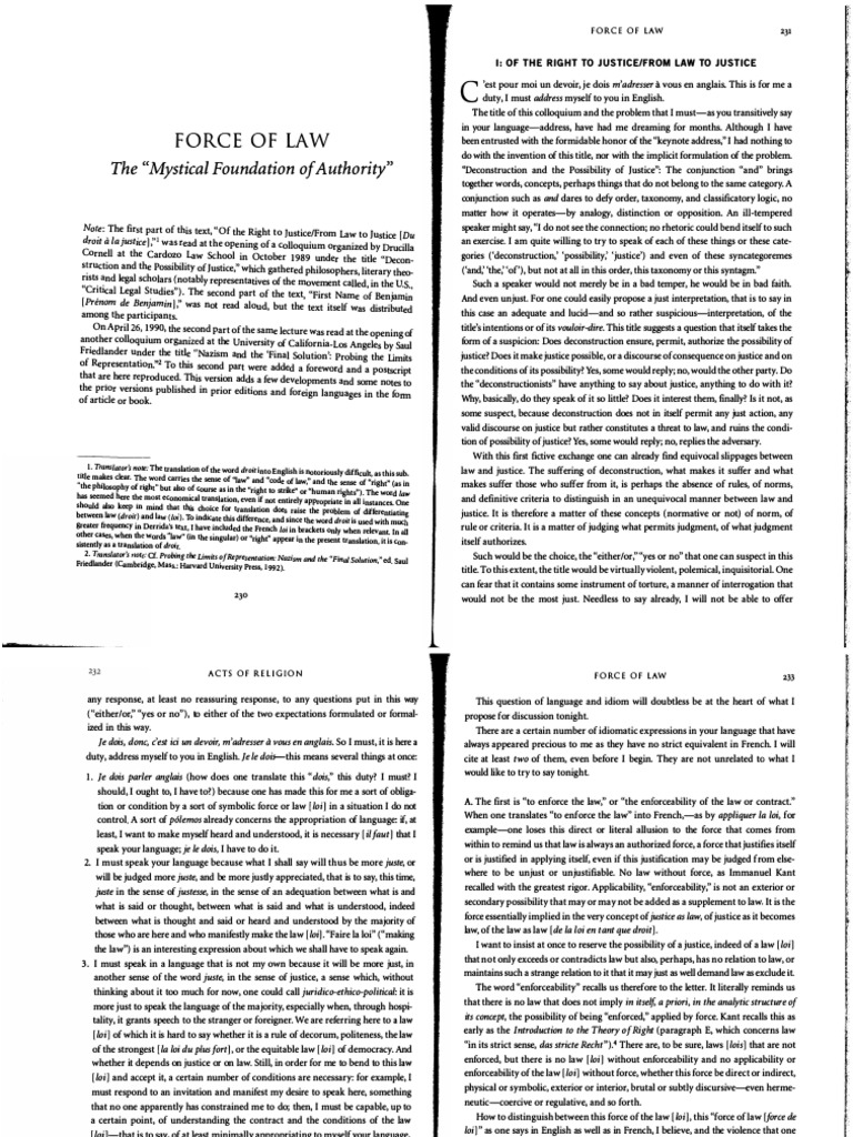 "Force of Law: The Mystical Foundation of Authority" in trans. Mary Quaintance, Cardozo Law Review 11 (1989-1990): pp. 920-1045. By questioning law's rather "violent," "polemical," "inquisitorial" character [Force of Law] intrusively asks the questions of whether deconstruction permits or denies any just action, any discourse about justice; whether it constitutes a threat to.