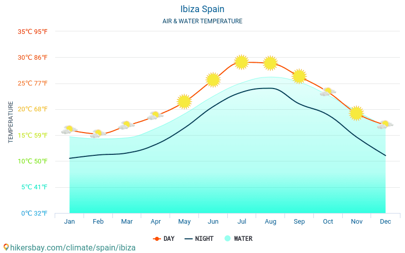 Ibiza has a mediterranean climate with hot dry summers and mild winters. If you're a sunseeker the best time to visit Ibiza is between June and August. The hottest month of the year is July with an average daily maximum of 30 C and an average low of 22 C.. Weather in Ibiza in September View all deals. Weather ; Things To Do; Travel Advice.