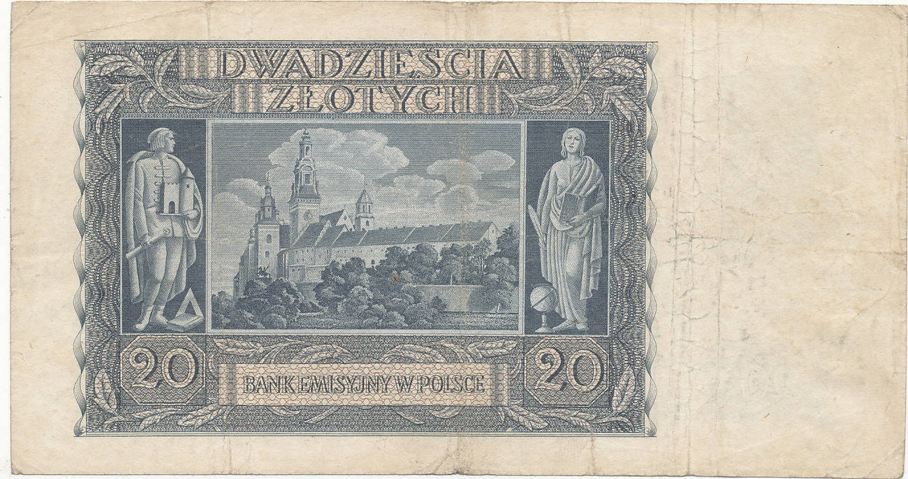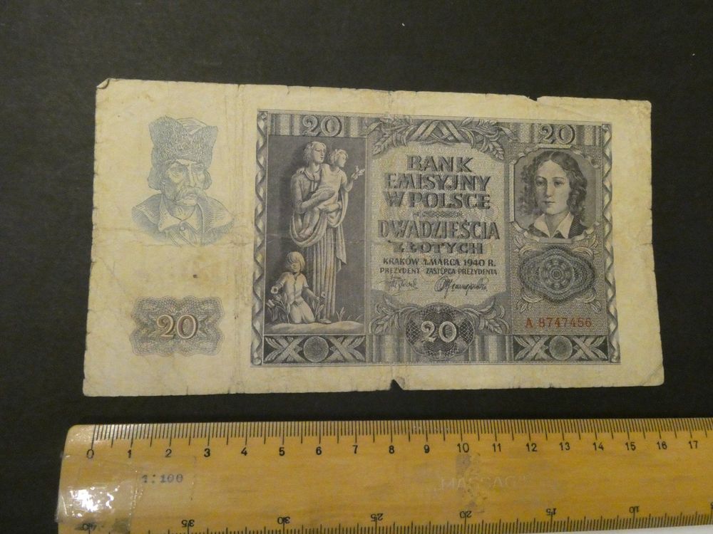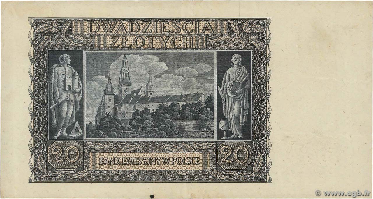 Poland - Bank Emisyjny w Polsce1940 Issue 20 Zlotych. New World Price Guide Search. Specifications. Year/Issue: 1940. Denomination: 20 Zlotych. Design. Face Color: Gray-blue on blue and red underprint. Face Type: Man in cap on watermark area at left, female statue with two children at left center.
