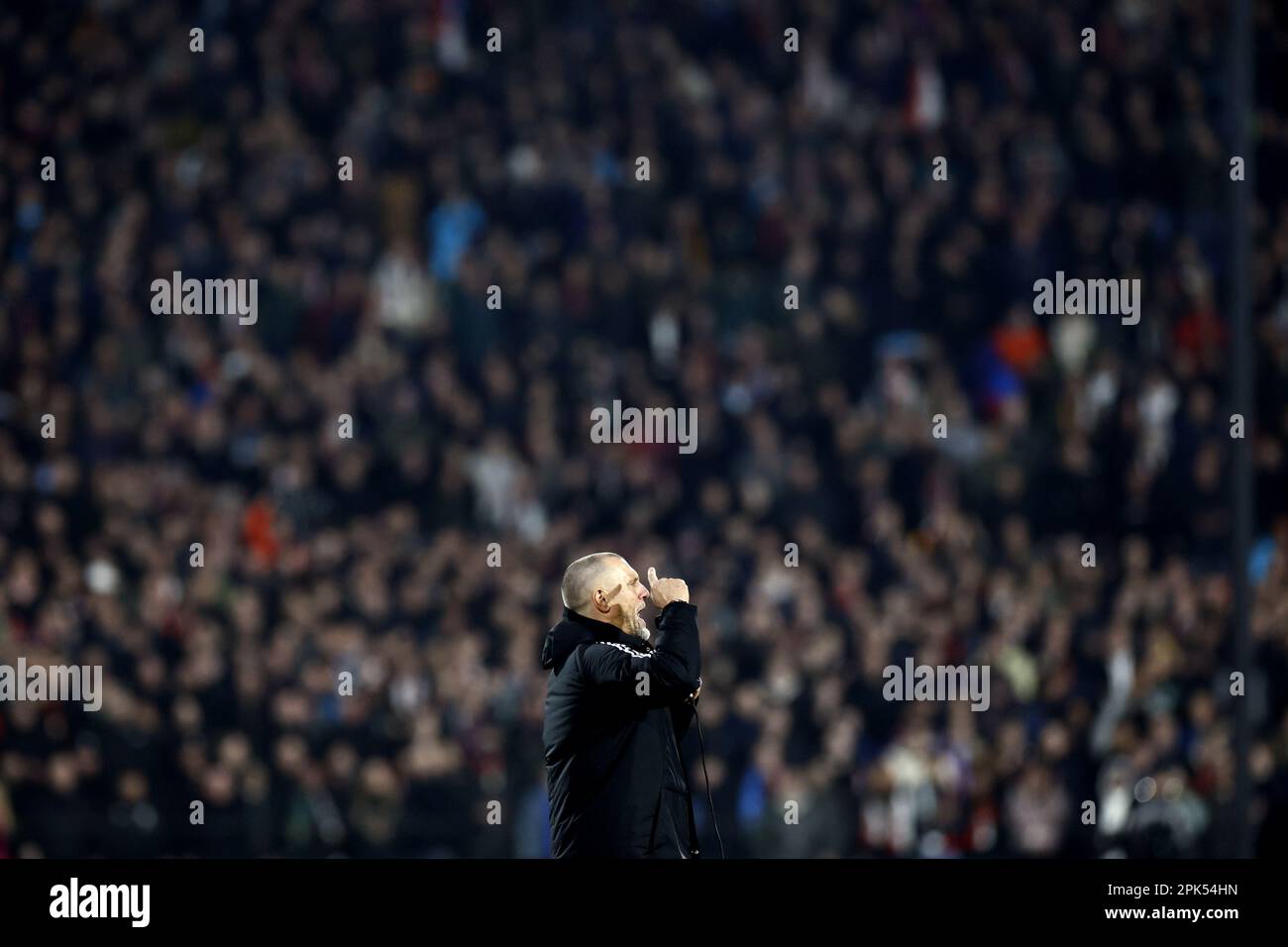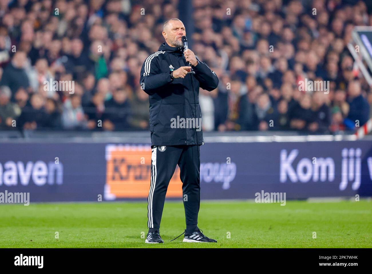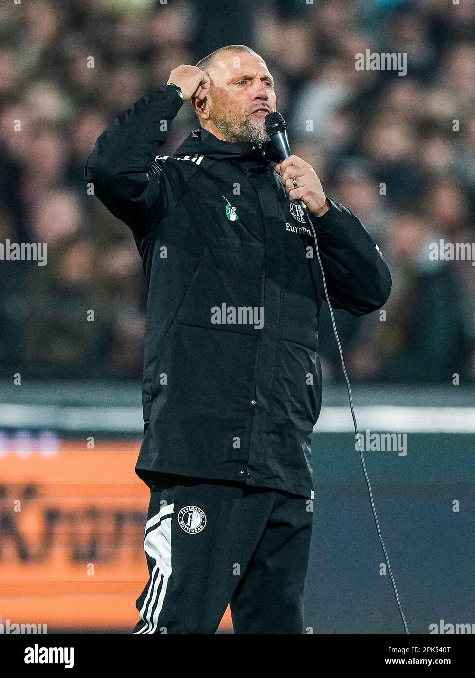 ROTTERDAM - Feyenoord assistant coach John de Wolf addresses the crowd during the Semifinal of the TOTO KNVB Cup match between Feyenoord and Ajax at Feyenoord Stadion de Kuip on April 5, 2023 in. Get premium, high resolution news photos at Getty Images