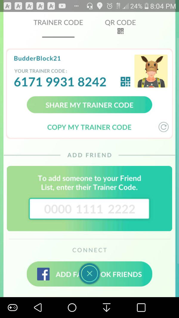 To add a Pokemon Go trainer as your friend, their 12-digit Pokemon Go Trainer code or is required. To add a new friend, in Pokemon Go game, go to Friends section. Then select Add Friend and enter 12-digit Pokemon Go Friend Code. If you have the QR Code already, select QR Code and scan the Pokemon Go QR code with your camera.