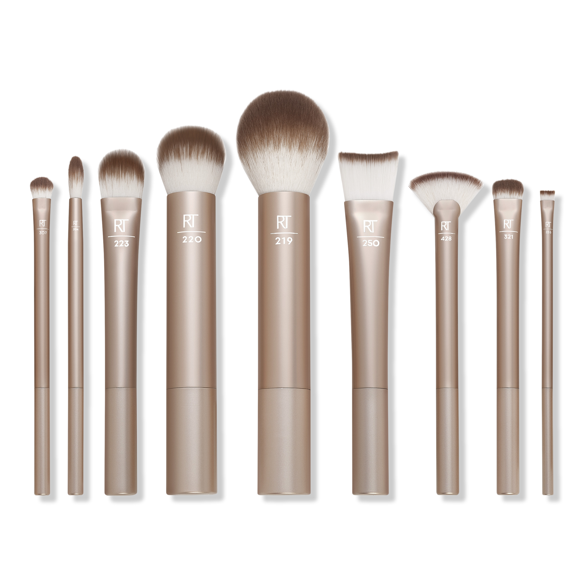 Real Techniques Au Naturale Complete Brush Kit Enhance your features and let your natural glow shine through with the Real Techniques Au Naturale Complete Brush Kit. These luxe brushes make for the perfect selfie! Kit includes primer brush, concealer brush, complexion brush, powder brush, light layers brush, fan brush, shading brush, and liner brushes. Pro Tip - dip the point of the brushes.