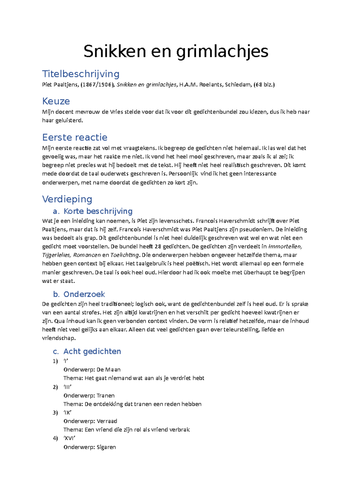 Leesverslag Poëziebundel Snikken en grimlachjes Snikken en grimlachjes Titelbeschrijving Piet