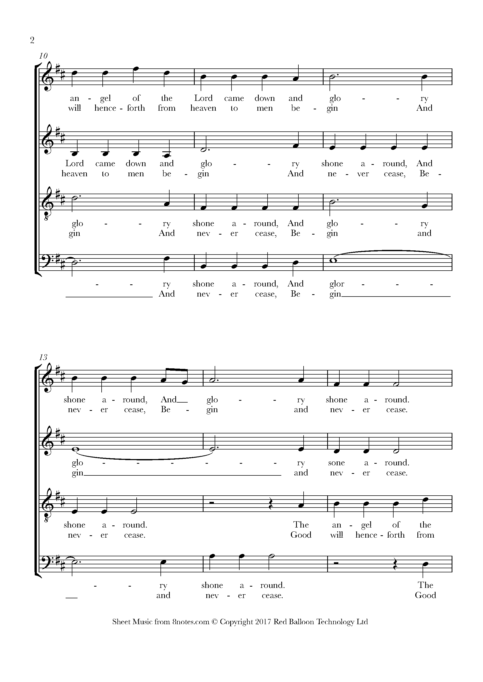 1. While Shepherds watch'd their Flocks by Night, All seated on the Ground, The Angel of the Lord came down, And Glory Shone all around. 2. "Fear not, said he, (for mighty Dread Had seiz'd their troubled Mind) " Glad Tidings of great Joy I bring " To you and all mankind. 3.